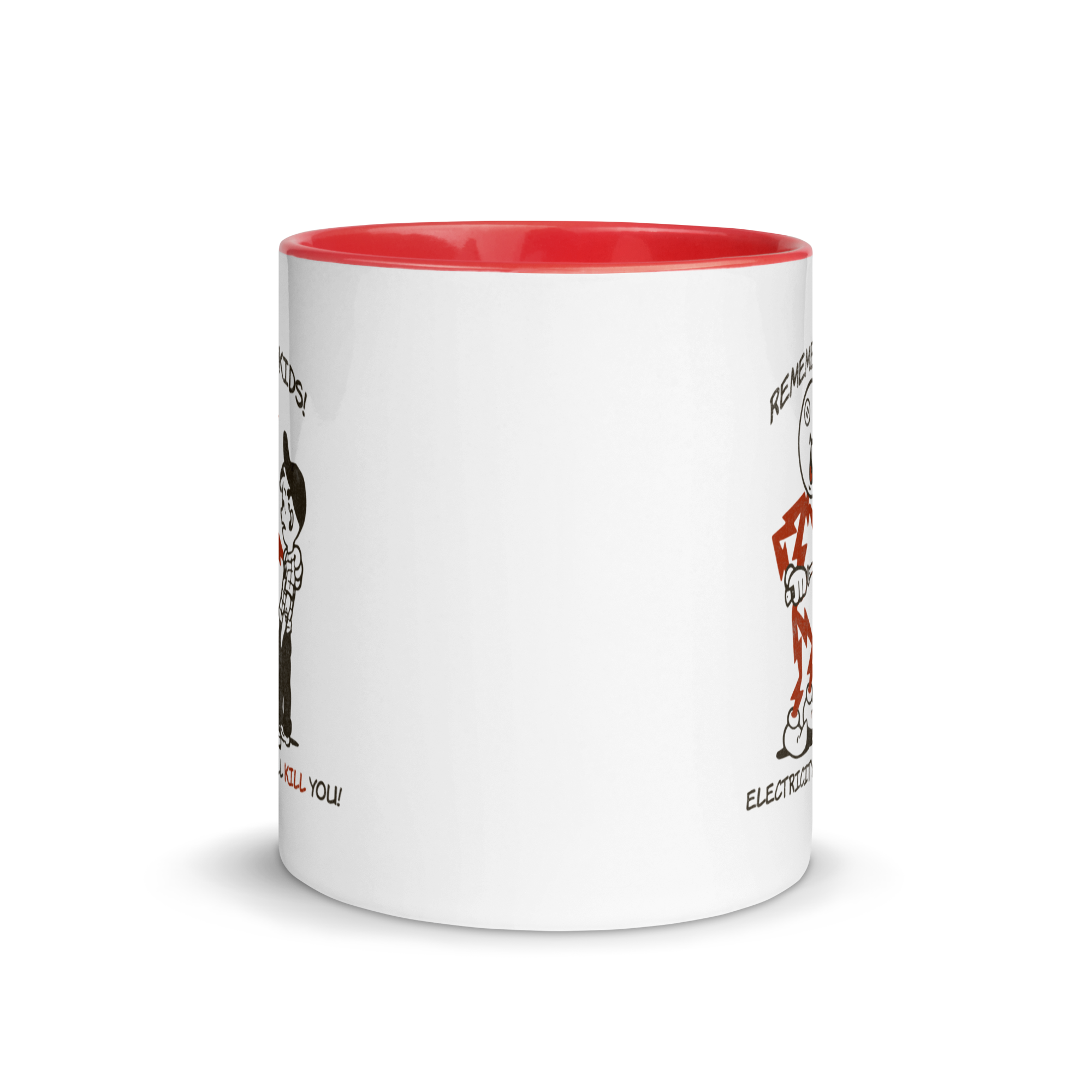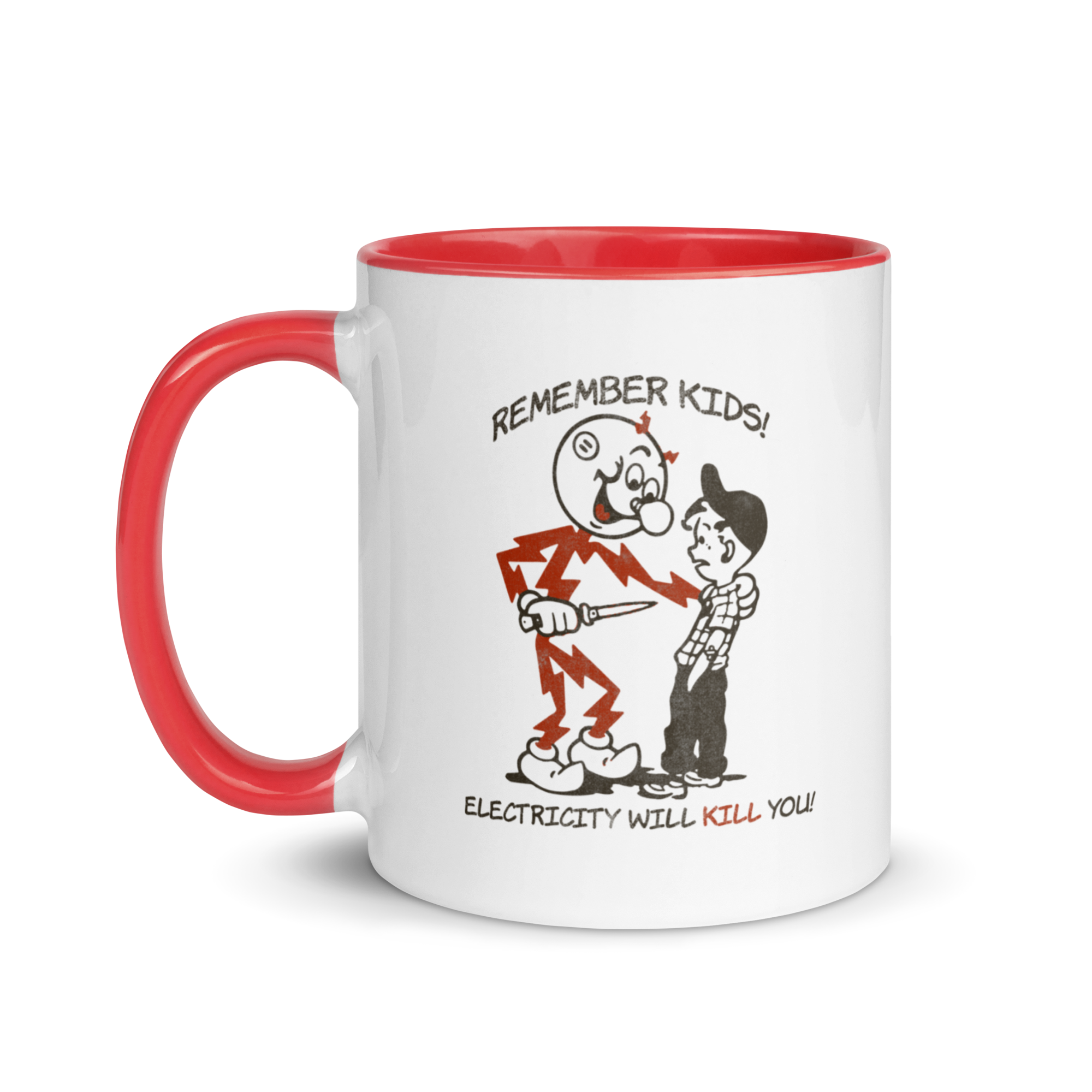 Remember kids, Electricity is your friend, but he can kill you.   • Ceramic• 11 oz mug dimensions: 3.79″ (9.6 cm) in height, 3.25″ (8.3 cm) in diameter• 15 oz mug dimensions: 4.69″ (11.9 cm) in height, 3.35″ (8.5 cm) in diameter• Colored rim, inside, and handle• Dishwasher and microwave safe