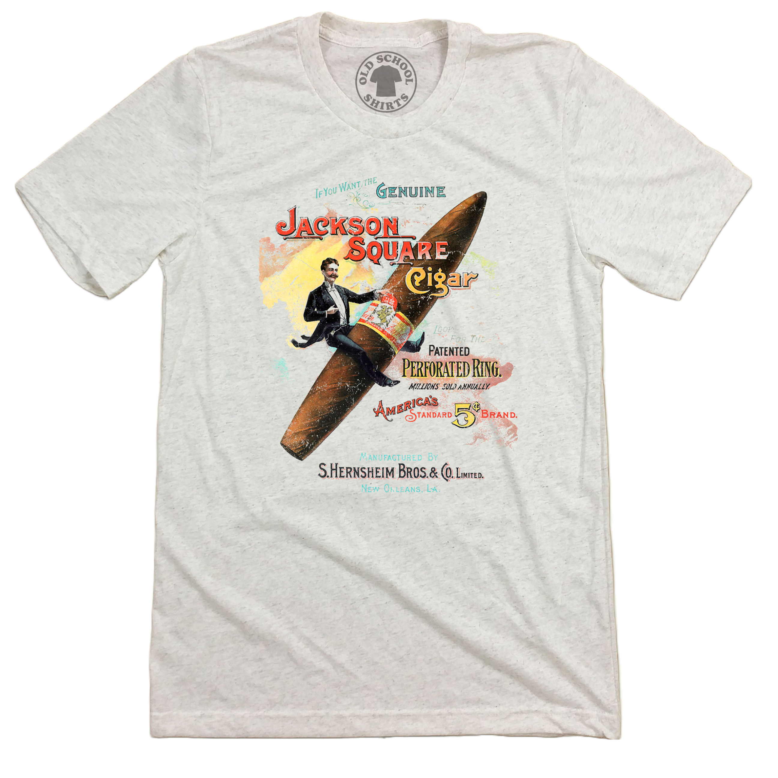 Get this vintage Jackson Square Cigar design on our tri-blend tan fleck tee.