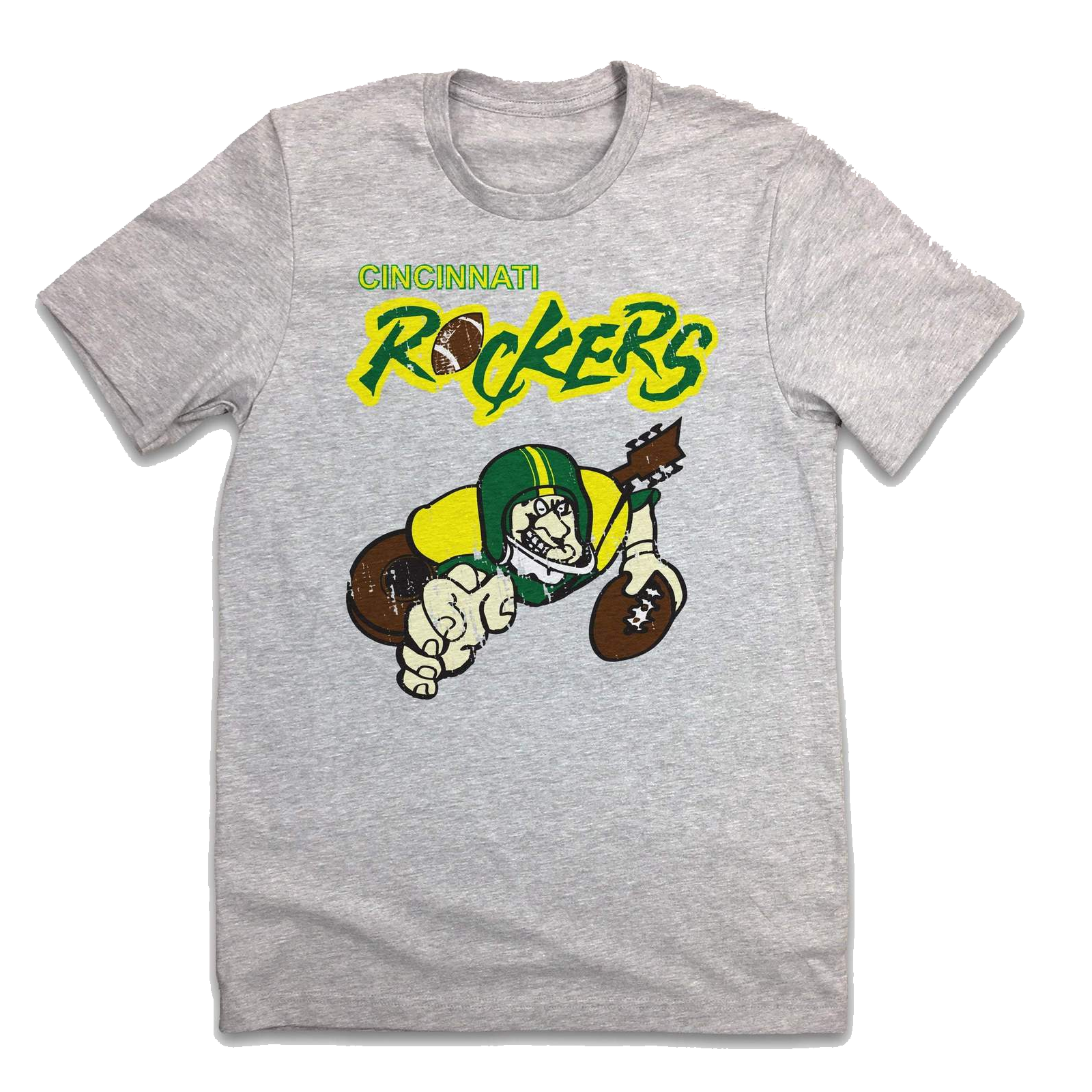 This shirt features an alternate logo for??The Cincinnati Rockers, the Queen City's Arena Football League team that played from 1992 to 1993 at Riverfront Coliseum.