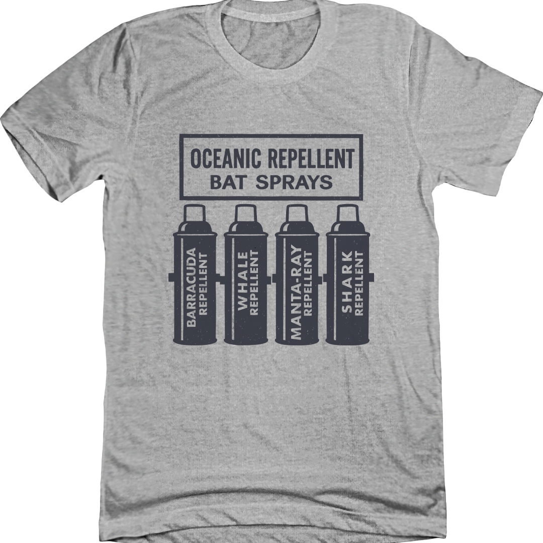 Holy ocean predators! Show off your retro crime-fighting style with our “Oceanic Repellent Bat Sprays” tee. This shirt features vintage-styled cans of Barracuda, Whale, Manta-Ray, and Shark Repellent—because you never know what dangers lurk in Gotham Harbor. Perfect for fans of campy caped crusader nostalgia. OSS17779
