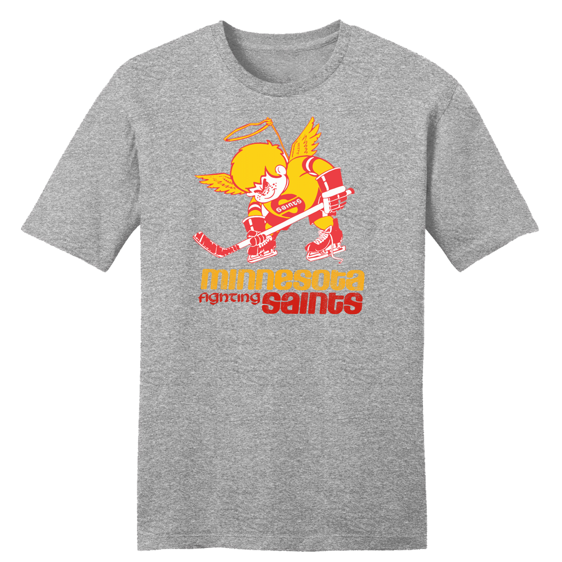 The original Minnesota Fighting Saints were charter members of the World Hockey Association in 1972. The team played its home games in St. Paul, while the rival NHL Minnesota North Stars played in suburban Bloomington. The Fighting Saints folded halfway through the 1975-76 season. In the fall of 1976, though, the Cleveland Crusaders moved to St. Paul to become the New Fighting Saints. They folded a few months later. CHECKOUT MORE VINTAGE HOCKEY SHIRTS AND MINNESOTA-INSPIRED DESIGNS